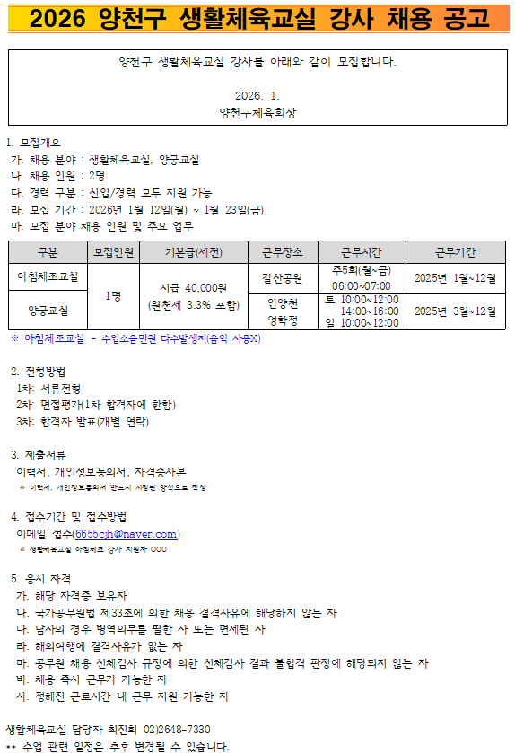 2026 생활체육교실 강사 채용 공고